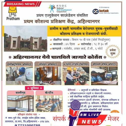 प्रथम एज्युकेशन फाउंडेशन, कामरगाव (अहिल्यानगर) यांच्या वतीने आपल्या गावातील १८ ते ३० वयोगटातील बेरोजगार आणि गरजूंना उद्देशून निवासी कौशल्य प्रशिक्षण व रोजगाराची सुवर्णसंधी उपलब्ध करून देण्यात आली आहे.